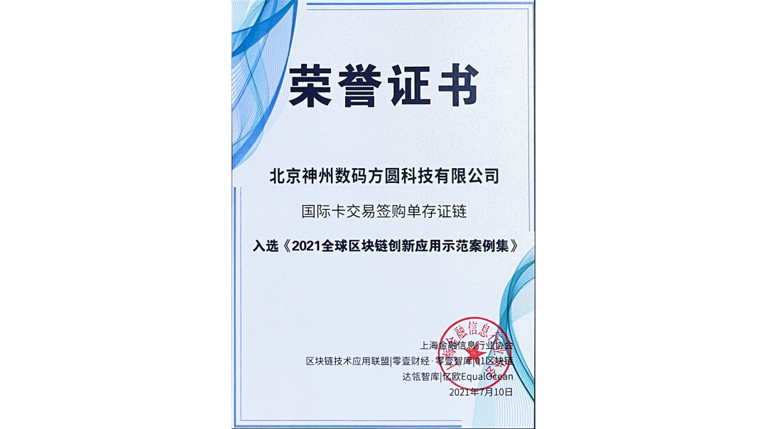 近日,2021世界人工智能大会“链络全世界智造新城市”区块链论坛在上海世博展览馆举行。神州信息子公司神州方圆“国际卡交易签购单存证链”案例入选《2021全球区块链创新应用示范案例集》。